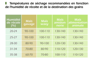 Der richtige Kompromiss liegt wahrscheinlich in den Erntestadien um die 22 bis 25 % Feuchtigkeit bei der Ernte. Er ermöglicht es, das klimatische Potenzial auszuschöpfen, vor dem Erscheinen von Verlusten zu ernten (Umknicken, Krankheiten) und von einer natürlichen Abtrocknung zu profitieren. Mit einer künstlichen Abtrockung kann die Qualität und das Volumen der Ernte sicherstellen, und die Möglichkeit verschaffen, bei einer Verschlechterung des Feldbestandes einzugreifen, z. B. bei Stürmen, Frost, gesundheitliche Schädigung durch Fusarium).